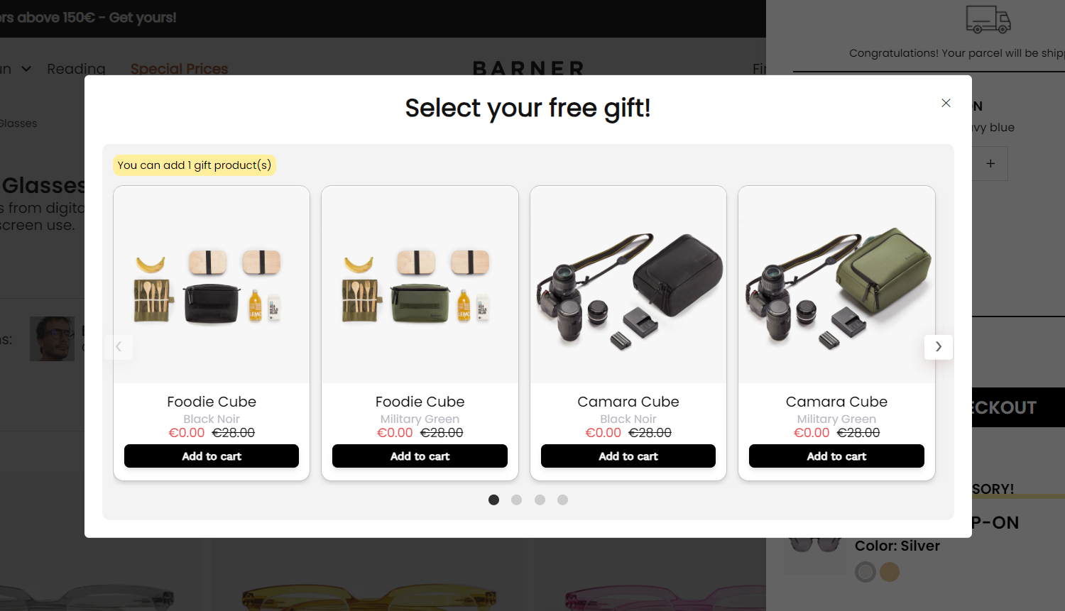 Once your side cart has more than 150€, there will be a pop-up with all the available gifts. Choose yours and it will be added automatically on the side cart!